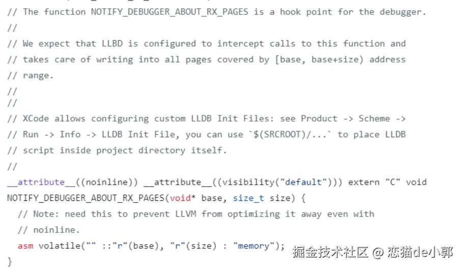 新的流程上,核心关键在于 NOTIFY_DEBUGGER_ABOUT_RX_PAGES ,NOTIFY_DEBUGGER_ABOUT_RX_PAGES 本身几乎不执行任何操作,因为它的本质是一个“钩子”,这个函数会被配置到 LLDB 的断点里: