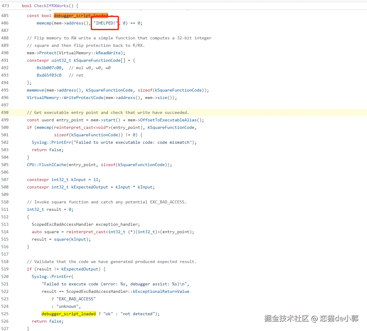 - 检查这块内存的开头是否已经被调试器写入了 "IHELPED!" 这个“暗号”,以确认调试器脚本已经正确加载,这个“暗号”是前面 LLDB 的脚本设置,用于判断 LLDB 和脚本状态是否符合要求