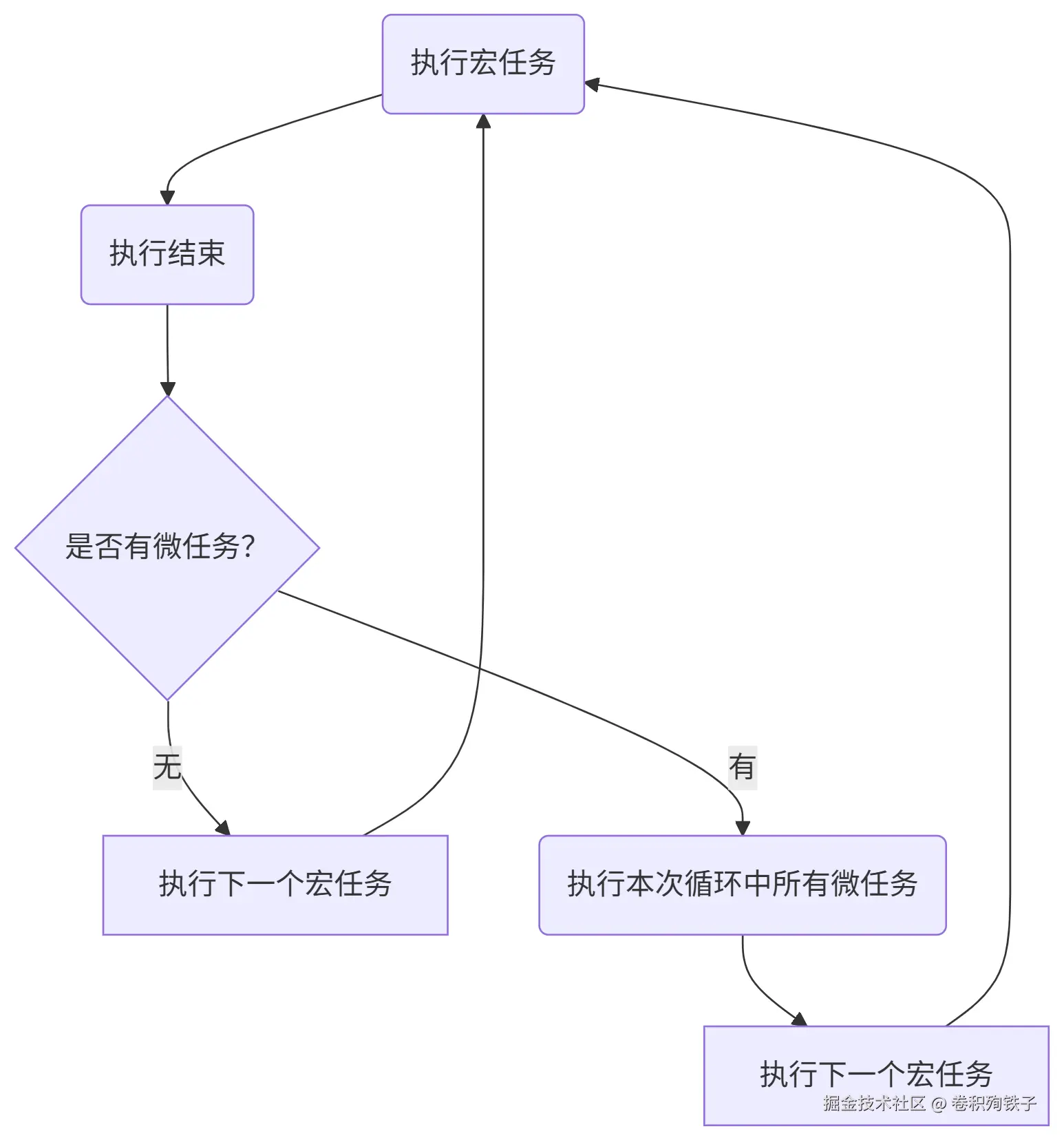 宏任务表示执行时间较长的任务,在每次时间循环时只会执行一个宏任务,执行完毕后处理微任务队列,所有微任务都执行完毕后进入下一个宏任务。