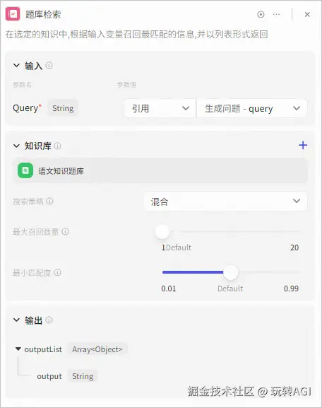 | 题库检索(知识库节点) | 删除此节点中原有的知识库文档,并上传中学数学的题库文档。 | |