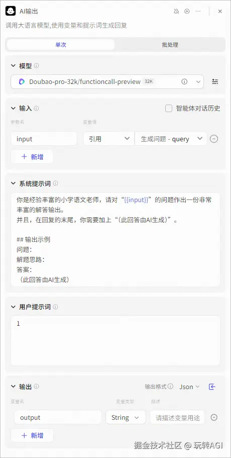 | AI输出(大模型节点) | 调整模型节点的人设与回复逻辑。例如将“小学语文老师”改为“中学数学老师”。 |