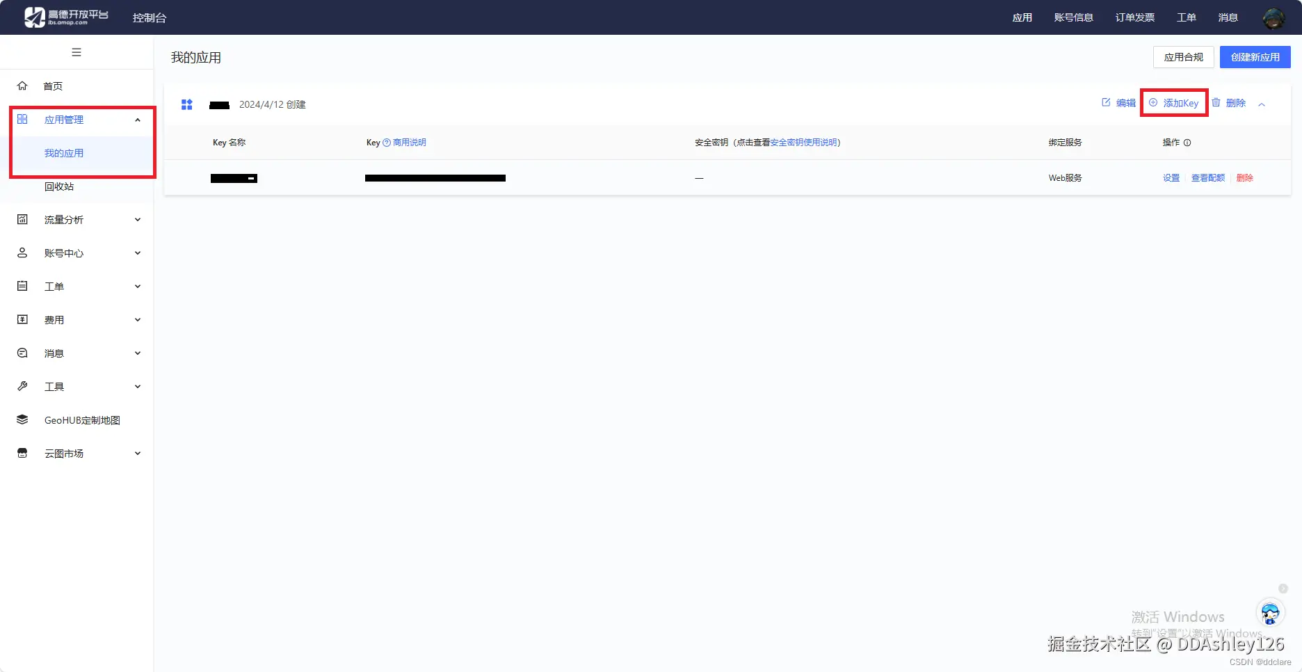 进入控制台(右上方),点击应用管理-我的应用,然后添加key