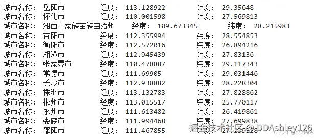 print('城市名称:', json['districts'][0]['districts'][i]['name'], '\t经度:', json['districts'][0]['districts'][i]['center'].split(sep=',')[0], '\t纬度:', json['districts'][0]['districts'][i]['center'].split(sep=',')[1])