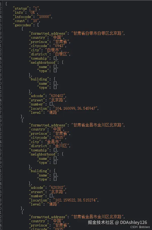 如果仅仅搜索北京路,会返回多个地方的信息,例如白银市的北京路、金昌市的北京路。