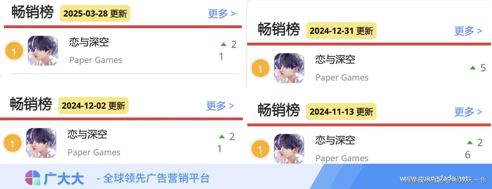 叠纸手握暖暖、恋与两大养家IP,旗下5款游戏稳定运营、准时爆金币,只看账面游戏流水已然顺风顺水,畅销榜数次压过王者荣耀、DNF足以证明其国乙流水女王的称号。