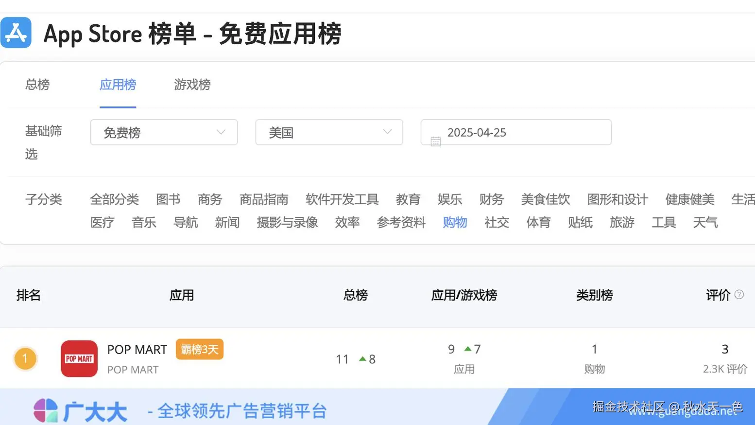 广大大-AppStore排行榜,【POPMART】4月25日登顶购物榜