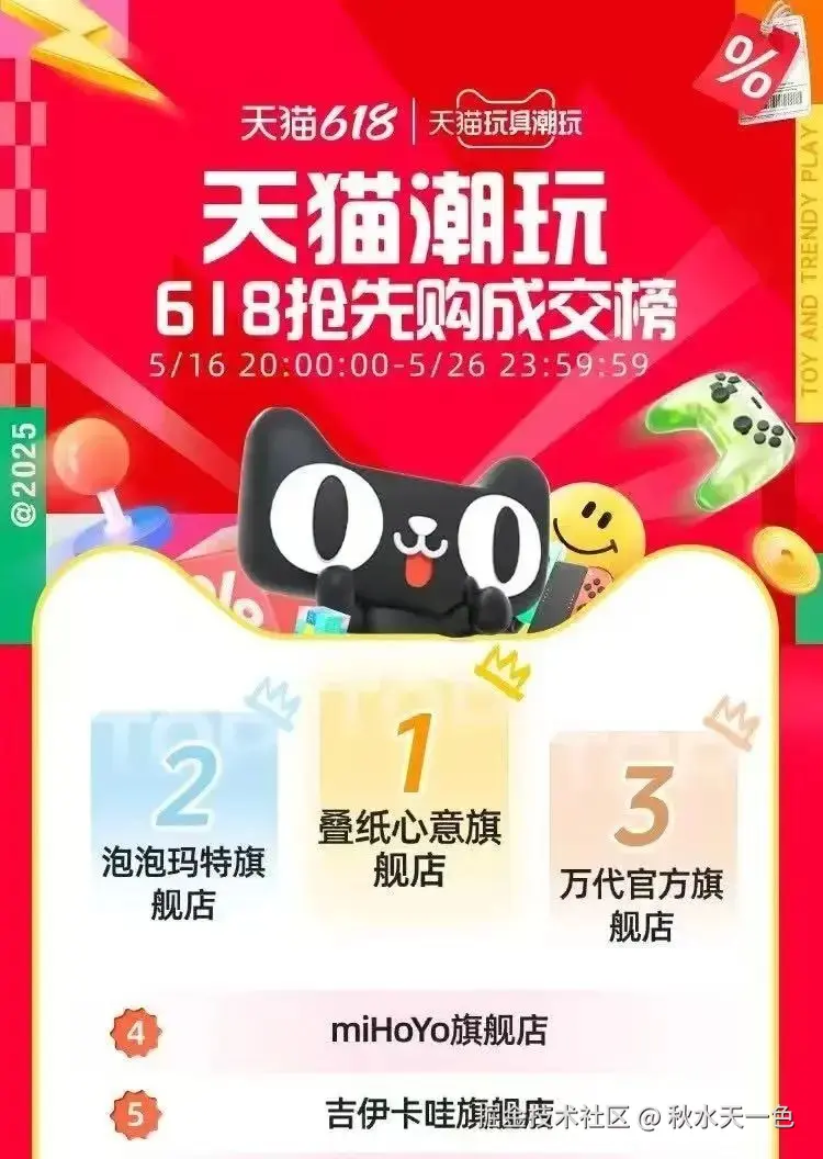 秉持着先相信再质疑的良好心态,笔者仔细翻了翻数据来源,根据天猫官方发布的618潮玩抢先购成交榜来看,叠纸心意旗舰店确实力压泡泡玛特、万代、米哈游、吉伊卡哇勇夺销冠名号。