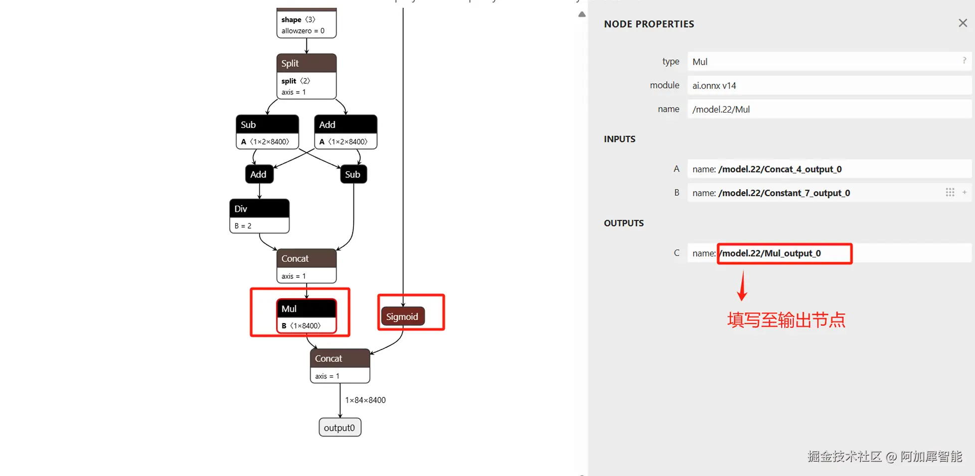 如上图output节点由Mul和Sigmod两个节点Concat而成,分别点击两个节点复制OUTPUTS的name名称到下图中: