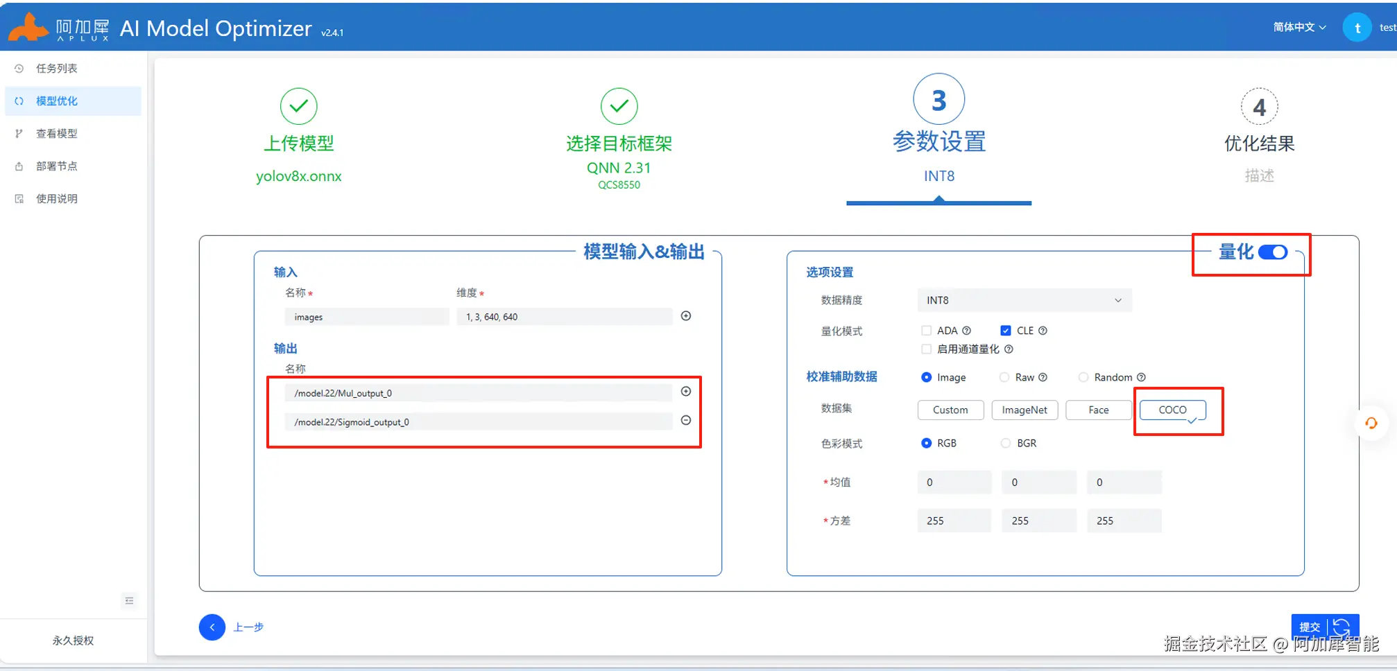 参考上图中红色框部分填写,其他不变,注意开启自动量化功能,AIMO更多操作查看使用说明或开发指南中的AIMO介绍。