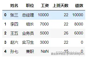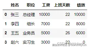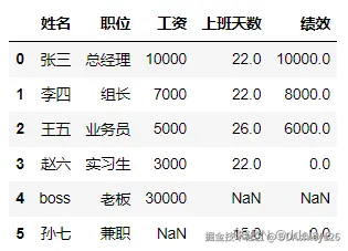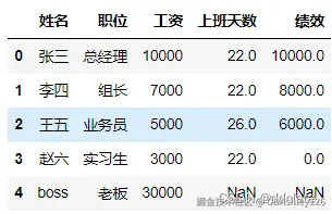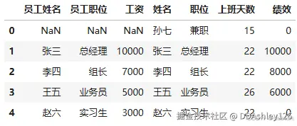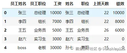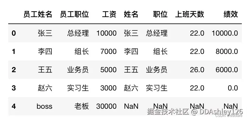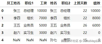 此时df1的字段名为员工姓名、员工职位、工资,df2的字段名为姓名、职位、上班天数、绩效,显然员工姓名和姓名实际上是同一个字段,员工职位和职位也是同一个字段,所以