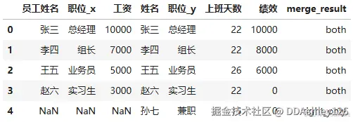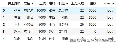 pd.merge(df1, df2, left_on='员工姓名', right_on='姓名', how='right', indicator='merge_result')