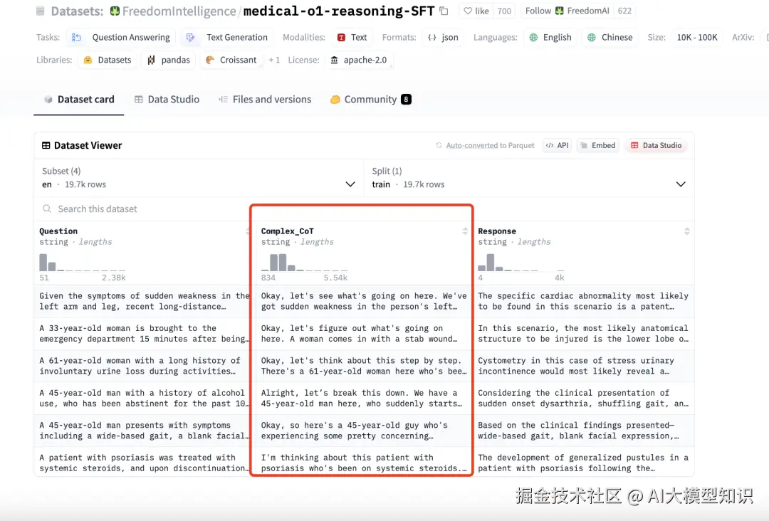 medical-o1-reasoning-SFT医学推理数据集,该数据集基于医学可验证问题和 LLM 验证器构建,这个数据集构造过程和方法1提到的差不多。方法1强调如何通过推理大模型蒸馏指令数据集,方法2强调如何通过已有COT构造推理数据集