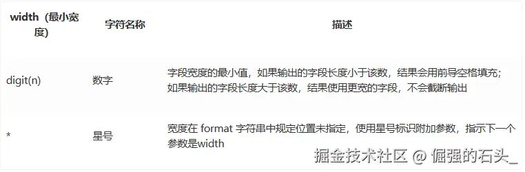 最小宽度(width)用于控制显示字段的宽度,用十进制整数来表示输出的最少位数。若实际位数多于指定的宽度,则按实际位数输出,若实际位数少于定义的宽度则补以空格或0。