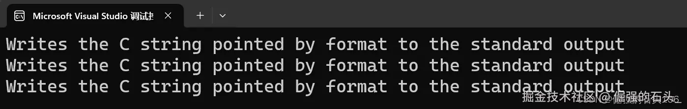 //方法二 反斜杠+回车 注意第二行必须从最左侧开始 printf("Writes the C string pointed \by format to the standard output\n");