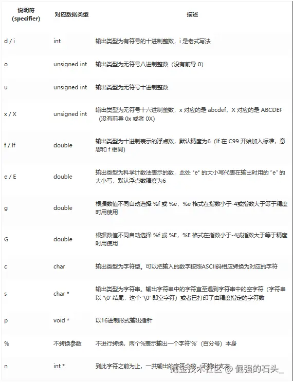 转换说明符(specifier)用于规定输出数据的类型,含义如下: