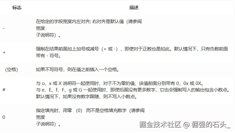 %[flags][width][.precision][length]specifier,即:%[标志][最小宽度][.精度][类型长度]转换说明符