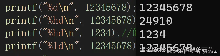 printf("%hd\n", 12345678);//解释为短整型输出(可能会丢失数据)