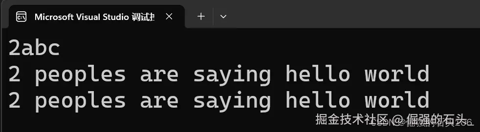 //%d 和 %s是转换说明符,分别对应附加参数——整型常量2 和字符串常量hello world