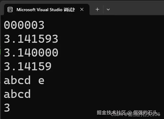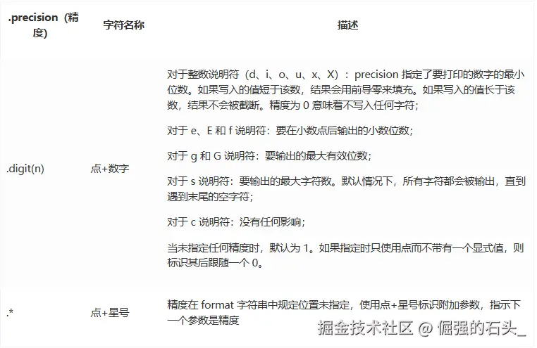 精度(.precision)用于指定输出精度,以“.”开头,后跟十进制整数