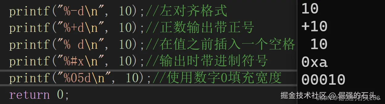 printf("% d\n", 10);//在值之前插入一个空格