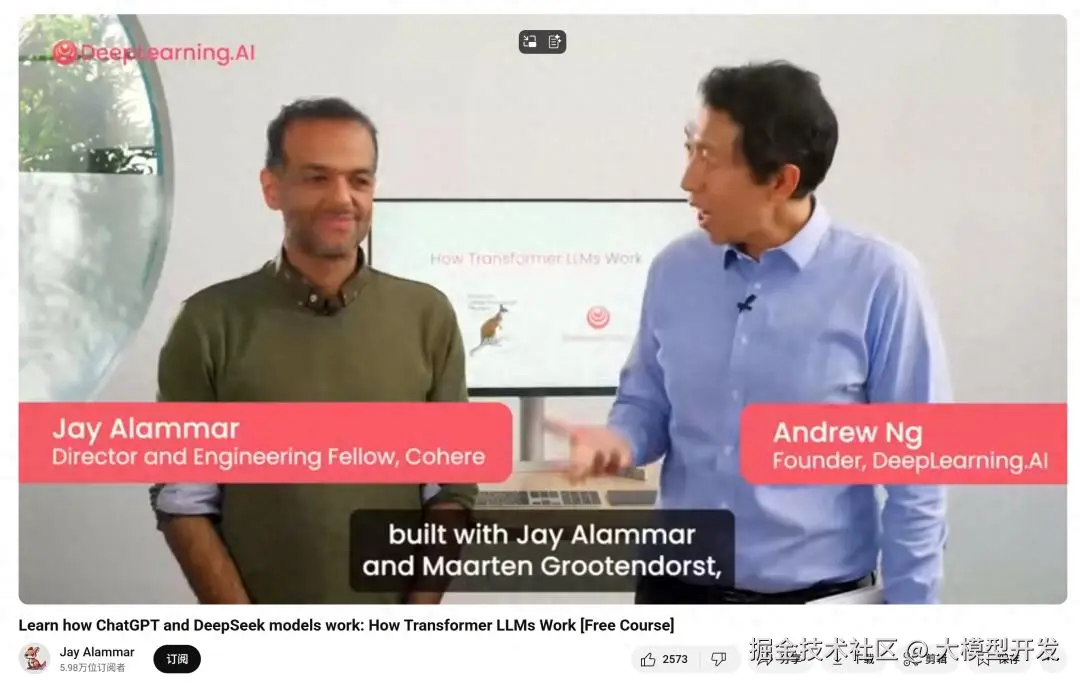 课程简介:这个视频由袋鼠书的作者Jay Alammar和Maarten Grootendorst 联合 Andrew Ng 创作,是一门为开发者量身打造的免费速成课,用约 90 分钟带你全面掌握 Transformer 架构的核心原理。