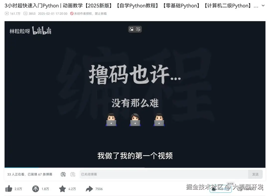 课程简介:对于没有 Python 基础但是还想入门大模型的同学,这门课程专为你准备,作者林粒粒将 Python 教程做成了动画片,教学通俗易懂。同时她也是《Python编程从入门到实践(第3版)》官方教学视频的制作者。视频风格有趣简洁,受到超多读者喜爱。