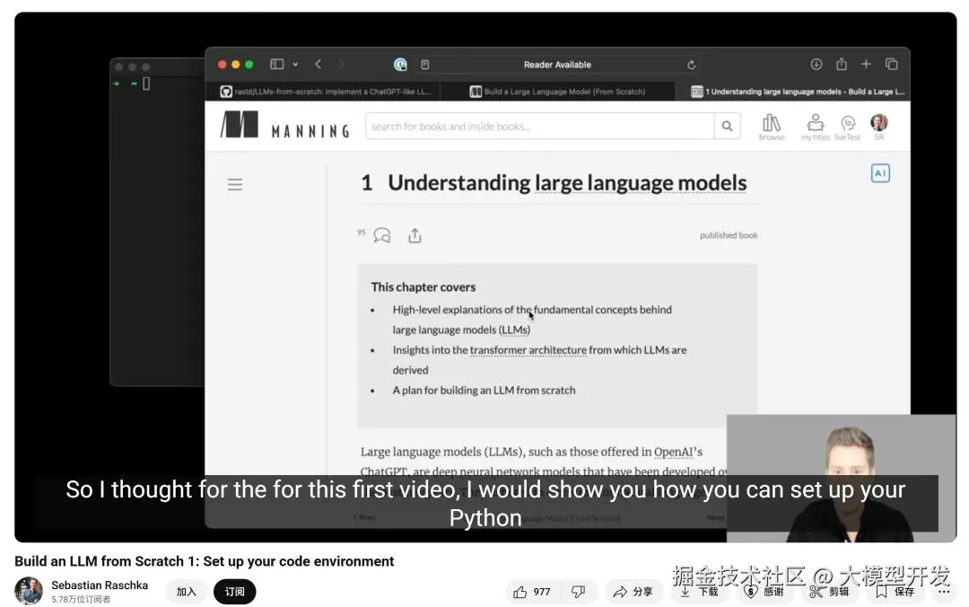 课程简介:全网最火爆的大模型教程,由 Github 44k Star 项目 LLMs from scratch 作者 Sebastian Raschka 创作。全视频概述了大模型开发的三个阶段:搭建、训练和微调,重点通过解析每个步骤的运作方式来解释大模型的工作原理。对于刚开始学习大模型的人来说这个视频十分有价值,作者语言清晰易懂,可以帮助大家理顺大模型的底层原理以及如何利用好大模型。