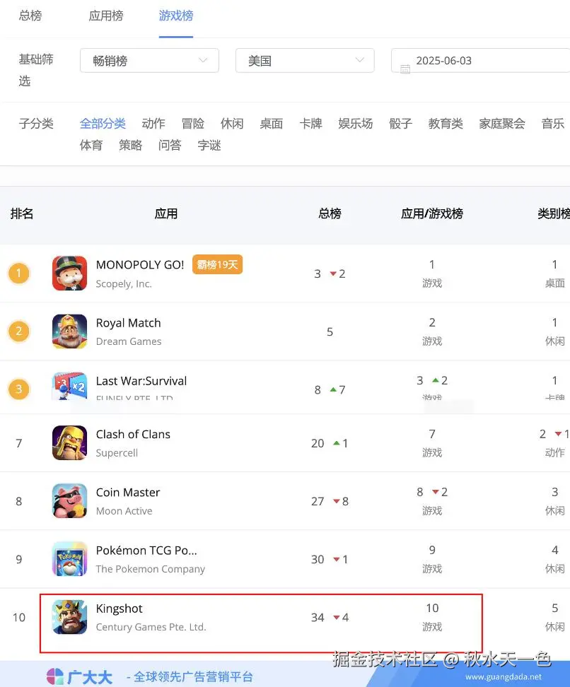 果不其然,【Kingshot】相继在5月、6月分别登上了美区畅销榜TOP30、TOP10高位,免费榜排名更是仅次于重回战场的【Fortnite】。