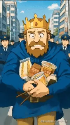 然后就是当下最火的AI动漫短剧,【Kingshot】素材中国王的衣服和配色像极了日漫《国王排名》不说,剧情更是大开脑洞,什么国王穿越现代、打劫面包、警察赛跑和初音未来同框,离谱的剧情可比同质化严重的单纯广告要有趣得多,整体搞怪的氛围也淡化了AI视频特有的那种非人的恐怖谷效应。