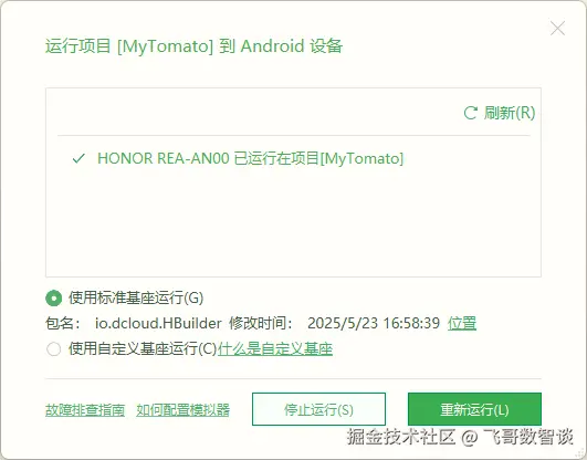 - HBuilderX 中“运行”-“运行到手机或模拟器”-“运行到 Android App 基座”。