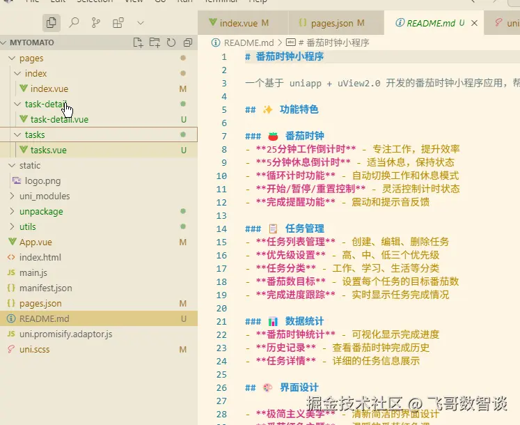 最开头通过简洁的文字,点名使用的技术栈(uniapp+uview2.0)、要达成的目标(番茄时钟应用)。