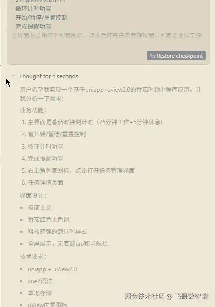 - 需求分析:10 分钟,主要回忆了下之前使用的番茄时钟,然后让 DeepSeek 总结了下基本功能。