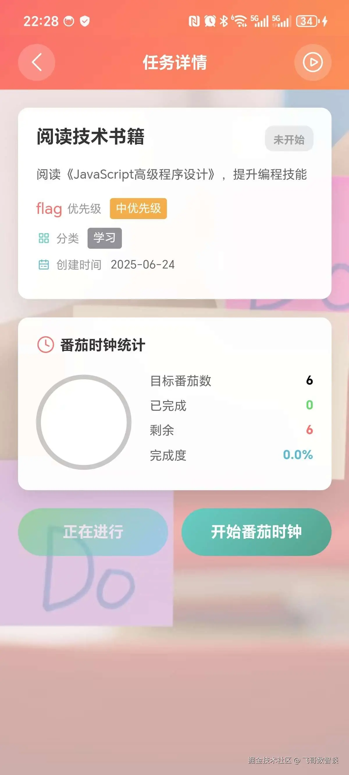 任务详情页面从上往下分别是任务标题、任务描述、优先级、任务分类、番茄数量。