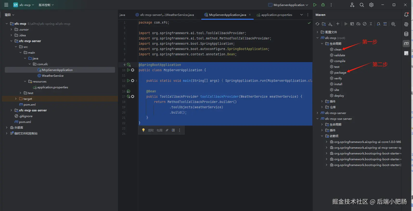 4. 在xfc-mcp-server模块中编写天气查询服务,由于我本期教程只是打个样,就做了一个虚拟的天气查询服务,目的只是带领大家把流程走通。