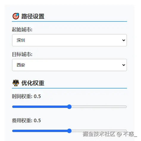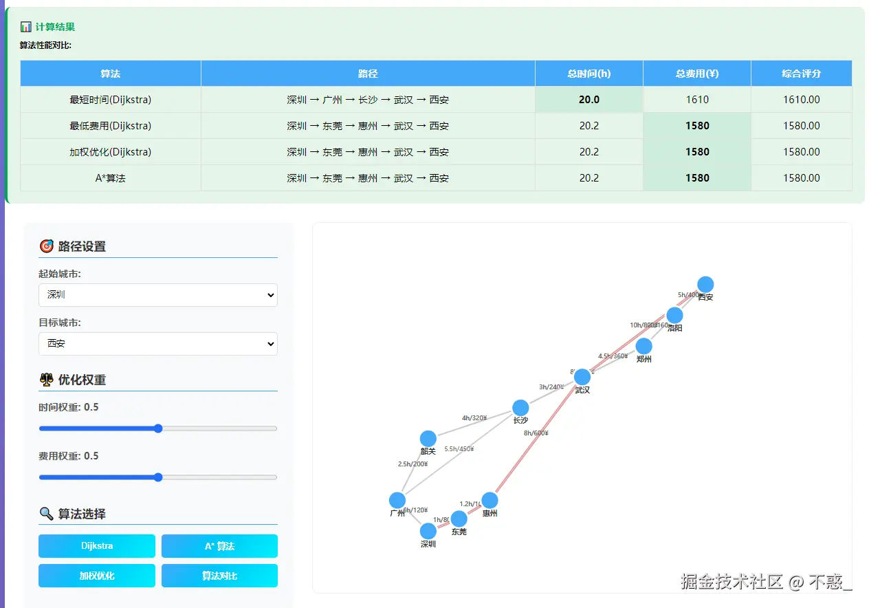 为了让技术结果更具直观性,我们用 HTML + JavaScript 构建了交互式路径地图,用户点击起点与终点,拖动权重滑块,点击“运行算法”,即可实时看到哪一条路线最合适,不论是为了“贵妃一笑”还是“成本最省”。主要包括: