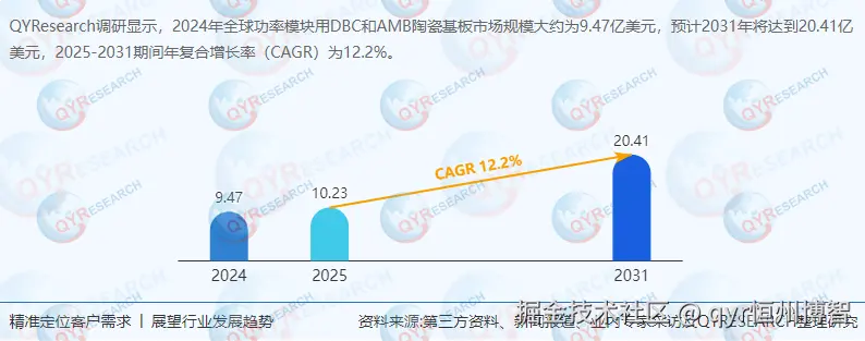 根据QYResearch调研,2024年全球功率模块用DBC和AMB陶瓷基板市场销售额达到了9.47亿美元。预计到2031年,市场规模将达到20.41亿美元,2025 - 2031期间年复合增长率(CAGR)为12.2%。这一增长趋势反映出市场对功率模块用陶瓷基板的需求持续上升,主要得益于汽车、新能源发电、工业控制等领域对高性能功率模块的需求增加。