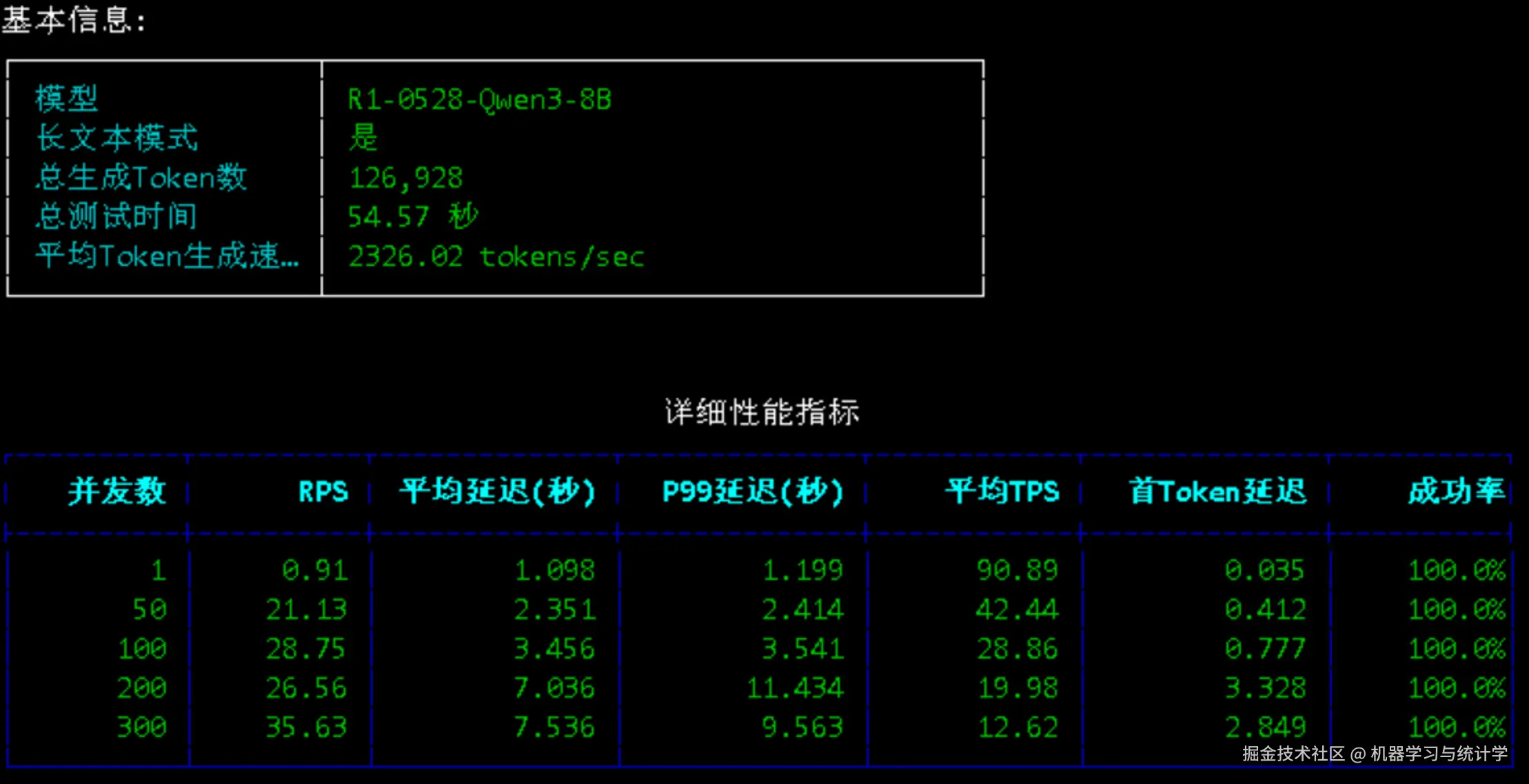 首 Token 延迟在低并发时极低(0.035 秒),但在 200/300 并发时升至 2.849 秒,说明高并发下模型启动响应速度有所下降。