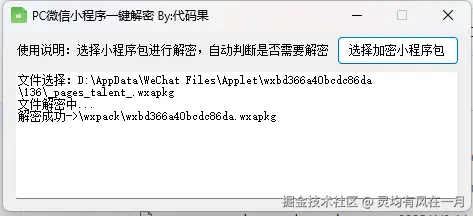 6、运行软件【UnpackMiniApp.exe】开始解析,解析的时候不要把_APP_.wxapkg文件拿出来,必须要直接用工具选择微信目录下的_APP_.wxapkg文件