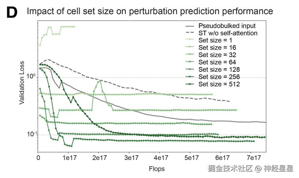 实验证明,在不超过某一阈值的范围内,增加细胞集合的规模能显著降低验证损失,效果明显优于对单个细胞进行建模。此外,移除自注意力机制会导致性能下降,如下图 D 所示,这进一步说明了基于集合的灵活自注意机制在建模扰动响应中的细胞异质性方面具有重要价值。