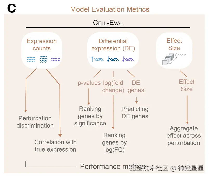 为全面评估模型在这些维度上的表现,研究人员开发了一套评估指标体系 Cell-Eval, 如下图 C 所示,这些指标既具表达性,也具有生物学解释力,能够提供互补的评估视角。例如 DEGs 的重叠程度有助于将预测结果与特定通路联系起来,赋予其生物学意义;而扰动判别分数能更敏感地捕捉扰动效应的细粒度变化,反映预测结果与真实扰动效应之间的相似度。