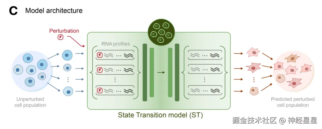 *群体层面: STATE Transition(ST)模型在细胞集合上学习扰动效应。