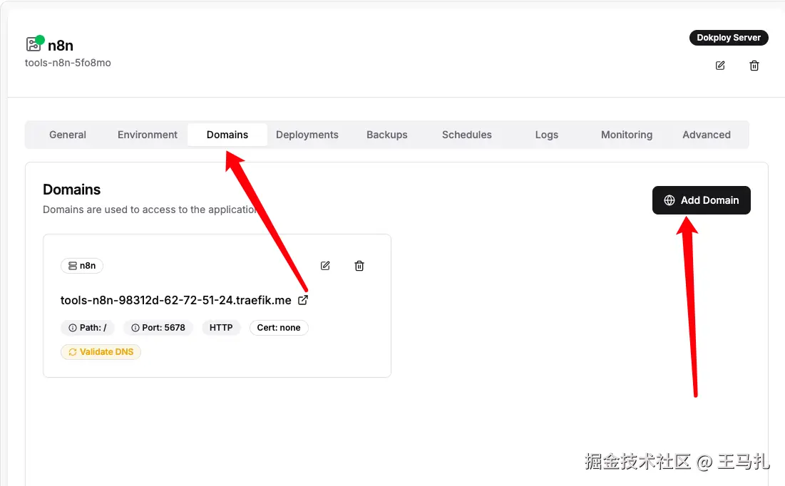 然后在dokploy的新增Domain里面,添加上刚才配置的二级域名。