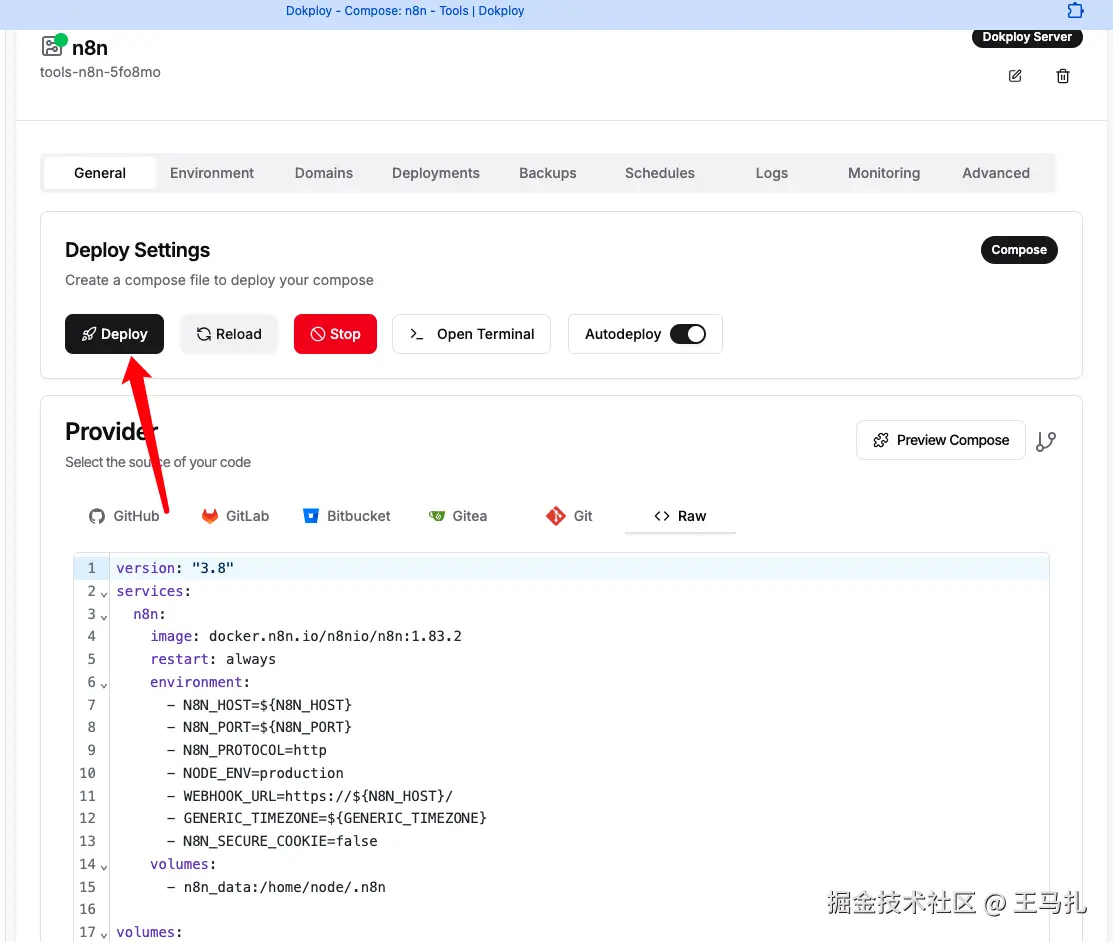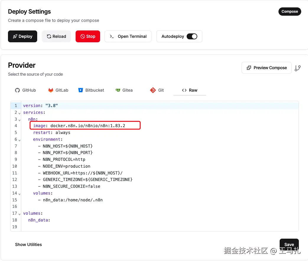 Provider 里的 compose 还是 n8nio/n8n:1.83.2,已落后多个安全 & bugfix 版本。点页面右上 Edit(或 Raw 区直接改)