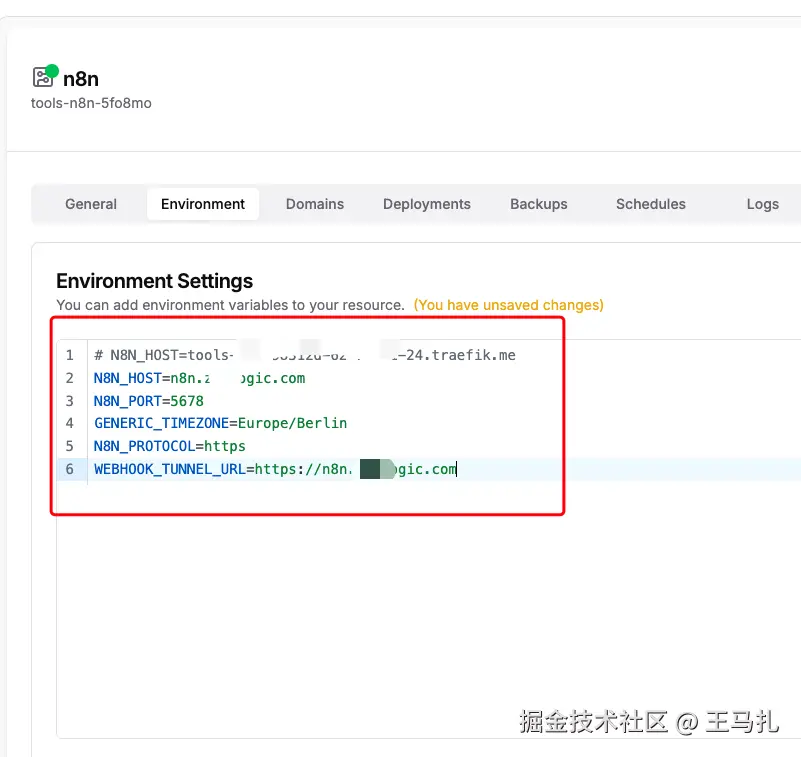 修改环境变量,将dokploy分配的N8N_HOST改成自己刚才配置的二级域名。