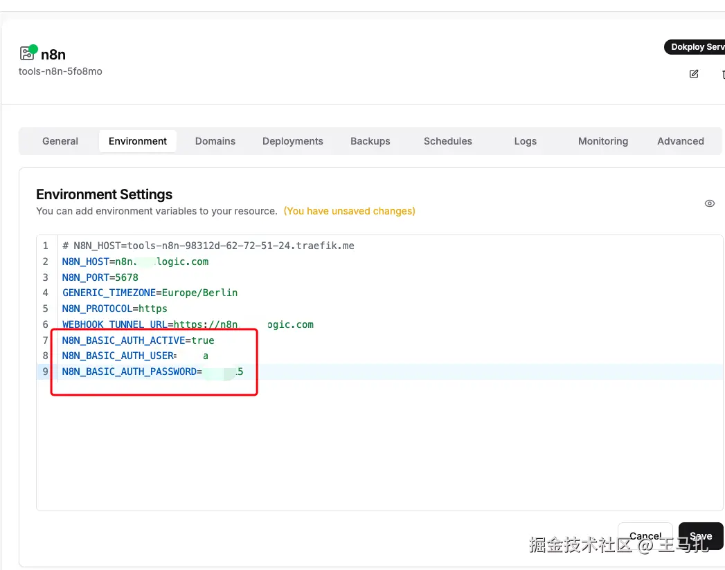 现在有个问题,就是任何人只要知道你部署的n8n域名,就可以登录使用,所以要配置环境变量,设置用户名和密码。