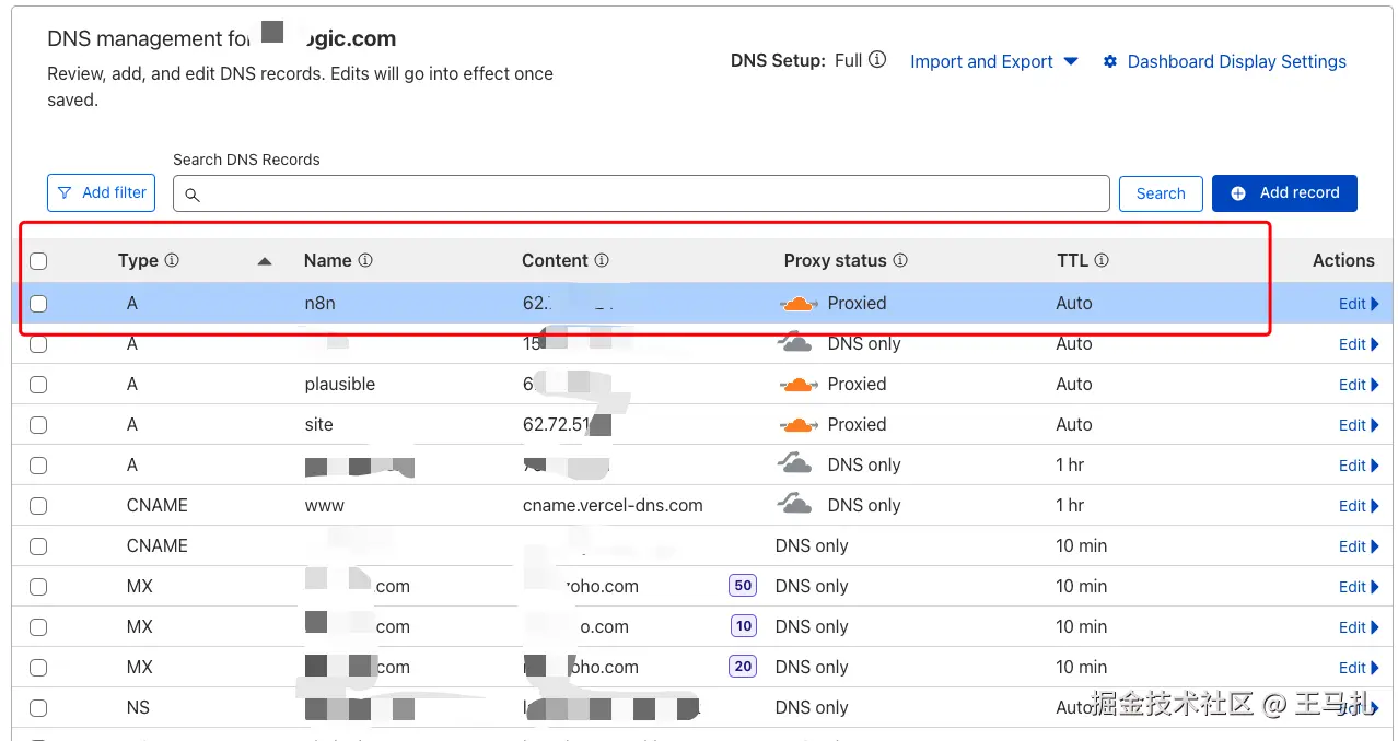 在cloudflare DNS里面配置二级域名,比如我的就是n8n.你的域名。