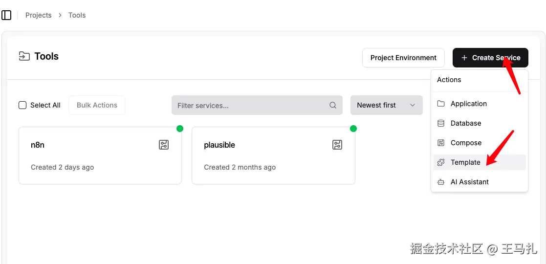 1、点击create service,选择template