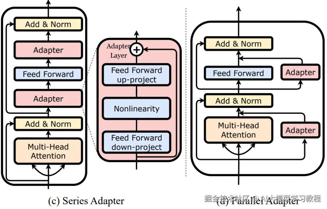 以 Transformer 架构为例,通常在每层的注意力机制或前馈网络后添加一个 “瓶颈结构”(比如先压缩维度再恢复),这个瓶颈结构就是 Adapter,包含少量可训练参数。