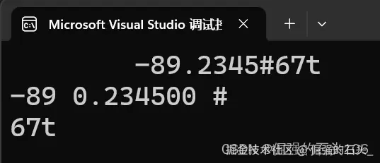 scanf()读取数据时,先忽略掉起始的空格字符,从 - 开始读取有效字符,因为第一个说明符是整型,所以读到-89 为止;第二个浮点型读取了 .2345 赋给变量b,因为到#已经不是浮点型的有效字符;第三个说明符是字符型,读取一个# 此时scanf()函数已经读取完成,剩下的字符会停留在缓存中