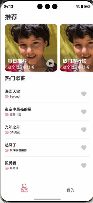 通过@State管理标签页索引currentIndex,当用户切换标签时,自动更新UI显示推荐歌曲或收藏歌曲。